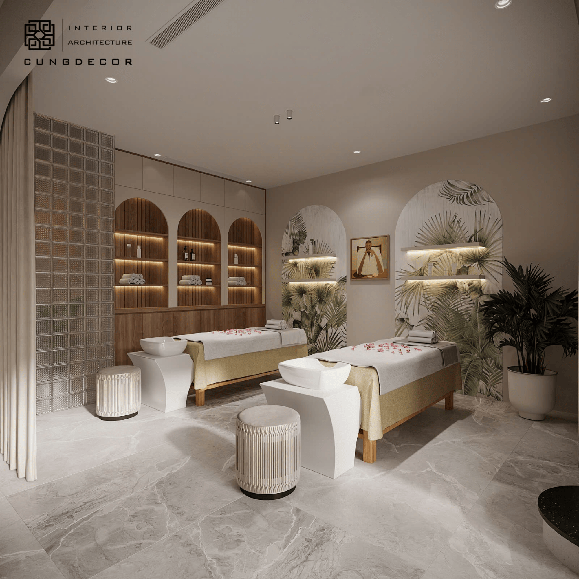 Khu vực trị liệu được bố trí khoa học với giường spa sắp xếp gọn gàng, điểm xuyết khăn cuộn và khay trang trí tinh tế, tạo nên tổng thể chỉn chu và chuyên nghiệp. Rèm trắng mỏng được sử dụng linh hoạt để phân tách không gian, vừa đảm bảo sự riêng tư vừa giữ được độ thoáng, mang đến một không gian spa thư giãn, tinh tế và chuẩn trải nghiệm cao cấp.